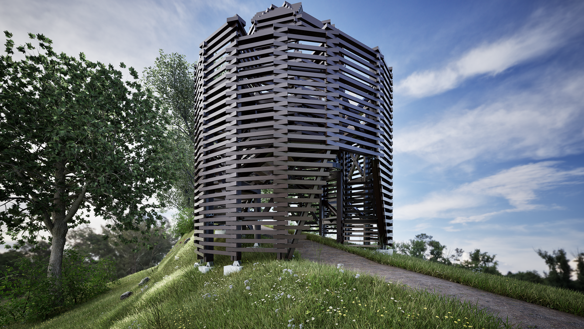 Cette petite tour posée sur une crête se laisse traverser par le « sentier de la frontière ».